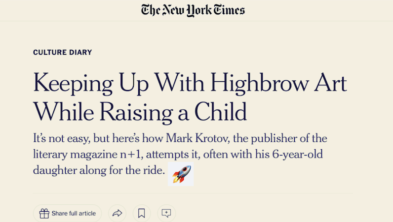 Check out the Culture Diary from 2025. n+1 publisher Mark Krotov details the cultural adventures he and his daughter share with some help from Blast Off! The piece has brought more attention (and subscribers) to the newsletter and our mission to be a trusted resource, exhausted parents can rely on.